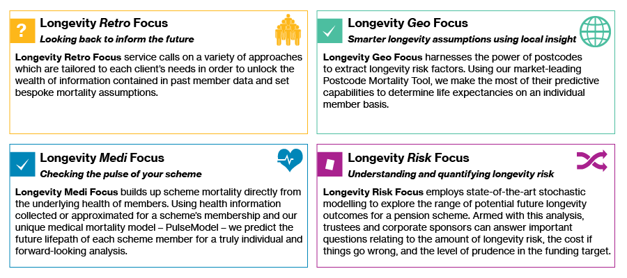 Our Longevity Focus offering is made up of four key components: Longevity Retro Focus, Longevity Geo Focus, Longevity Medi Focus and Longevity Risk Focus.