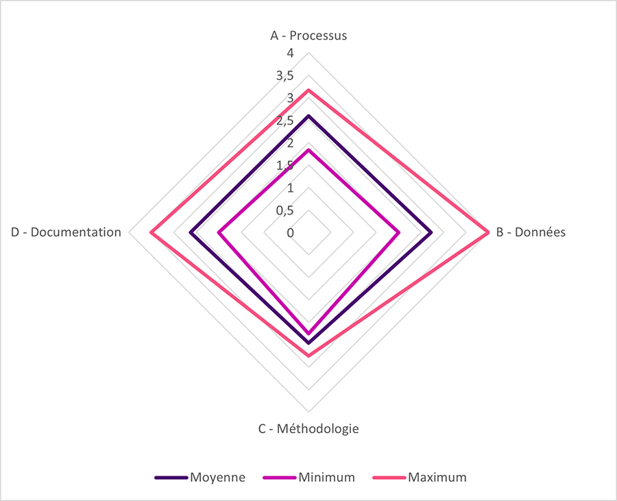 Grâce à notre position privilégiée, qui nous permet de travailler avec de nombreux assureurs, nous avons pu réaliser un état des lieux des pratiques de provisionnement auprès de nombreux acteurs français de l’assurance. Les données ont été compilées pour donner une note moyenne sur une échelle allant de 1 à 4 dans 4 domaines différents : l'efficacité du processus en lui-même, la qualité et le traitement des données, les méthodologies actuarielles appliquées et la documentation globale.