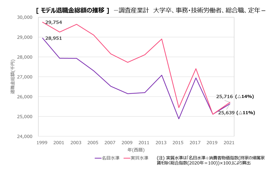 今から24年前、2000年4月に退職給付会計がわが国の企業会計に導入されたことによって、企業が確定給付型の退職給付制度を保有することによる会計上の積立不足発生のリスクがにわかにクローズアップされることとなった後は、退職給付を基本給や退職金前払い手当など、他報酬形態へと転換することによる水準引き下げや廃止が実施されることも珍しいことではなくなり、一部は確定拠出年金など、退職給付会計の対象とならない形に姿を変えて存続が図られているものの、全体の給付水準としては過去20年以上にわたって縮小傾向が続いている。中央労働委員会「退職金、年金及び定年制事情調査」によれば、大学卒、事務・技術労働者、総合職相当のモデル退職金水準は1999年から2021年の間に、名目水準で11%、実質水準では14%も低下している。