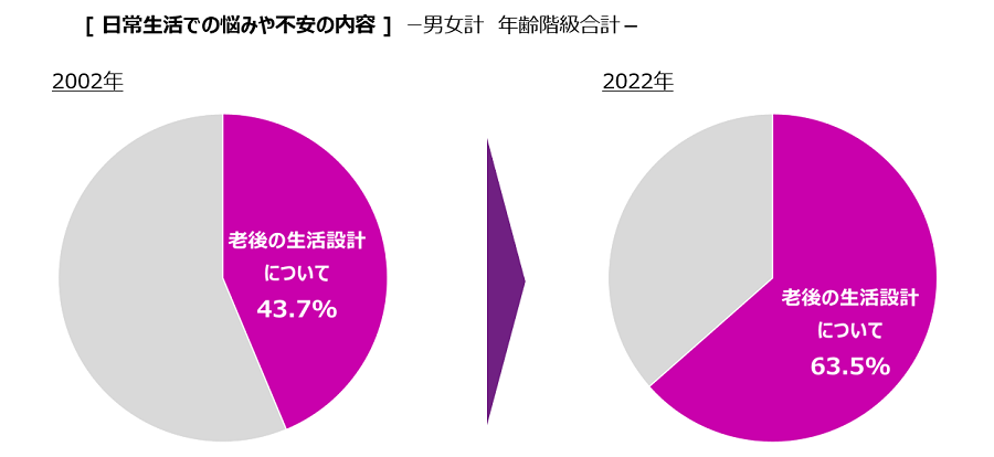 このことは、内閣府「国民生活に関する世論調査」において、老後の生活設計に不安を挙げる人の割合が、過去20年間で44%(2002年)から64%(2022年)へと増加し、日常生活における悩みや不安の中で最上位の要因となっていることとも決して無関係ではないだろう。WTWが隔年で実施している直近のグローバル意識調査(2022年)においても、日本の大企業~中堅企業に勤める人の66%が、自分の退職後へ向けての金銭的な準備が十分ではない、と回答している。