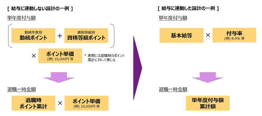 わが国における退職給付は、江戸時代の商家における「のれん分け」に始まると言われているが、かつては退職時点の給与に退職事由および勤続年数に応じた乗率を乗じて退職時に付与額を一括計算する、最終給与比例型の設計が主流だったことも相まって、報酬の後払い、というよりは在職中の勤労に対する褒賞・餞別のように見なされることが少なくなかった。さらにその最終給与比例型の設計が、経済成長期には給与水準の上昇による退職給付水準の急激な上昇を招くことが懸念され、年功型賃金や属人的な手当など、付与額計算に用いられる当時の給与が社員の貢献を正しく反映したものになっていないという批判もあって、計算方法の見直しが進められることとなった。その結果、付与額の計算に際して給与を参照しない設計として、資格や職務、勤続年数などに応じて付与される「ポイント」を役割・職務の大きさや貢献を間接的に表す指標として採用し、ポイントの在職中累積額を基に付与額を計算する、というポイント制退職給付の導入が進み、給与との連動が切り離された形で独自の発展を遂げることとなった。