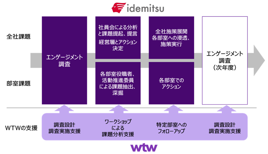 2019年度に昭和シェル石油株式会社との経営統合を経て、2023~2025年度の中期経営計画においては、人財戦略を経営戦略の根幹に据え、人財戦略のKPIとしてエンゲージメント調査の結果を活用しています。従業員のエンゲージメントを定量的かつ継続的に調査し、WTWのワークショップ等を通じて、従業員の皆様が自ら詳細に自部室の課題や強み・弱みを分析し、解決策を実施することで同社の事業および従業員の持続的成長につなげています。