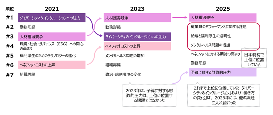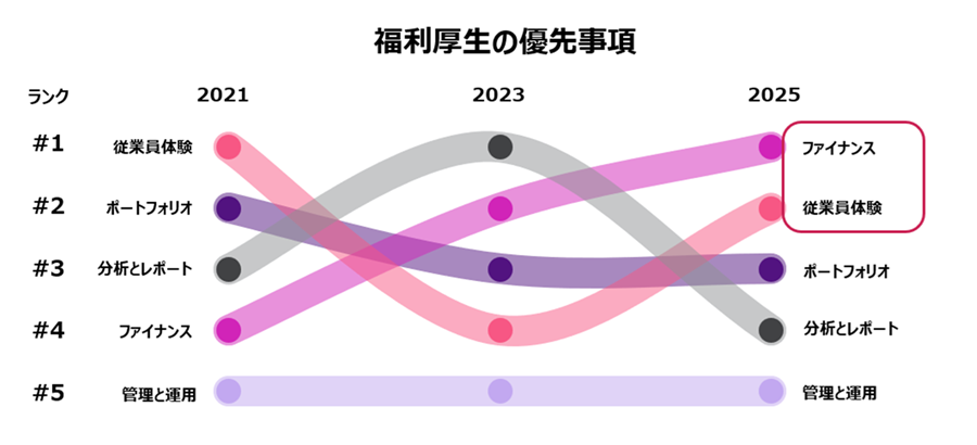 その一方で、人材獲得と人材定着、社員のウェルビーイング向上は引き続き重点取り組み事項です。企業は、福利厚生を人材に関する課題解決のための手段として活用しようとしています。
