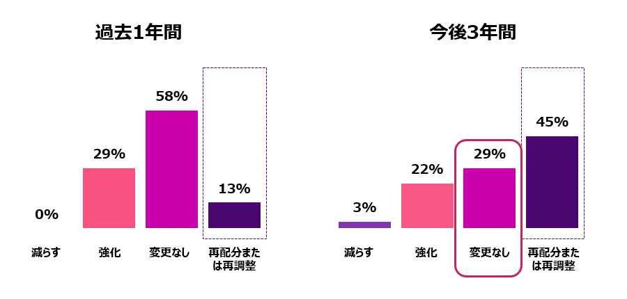 | 戦術 | コスト制約下での価値の最大化 | 福利厚生を拡充している企業は少数です。多くの企業は、より多くの選択肢とサポートを通じて従業員が福利厚生を最大限に活用できるよう、支出の再調整を図っています。 また、ベンダーのコスト削減や追加サービスを通じた付加価値の追求、福利厚生チームへの業務拡大、コストとリスクに関する分析の強化などにより、コスト管理を徹底しています。 |