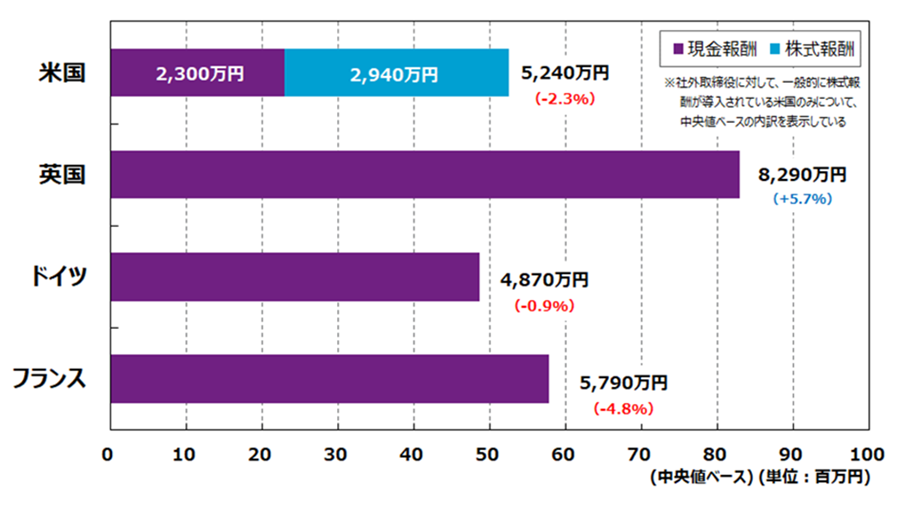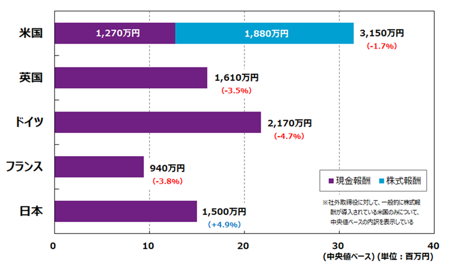 ※ 社外取締役報酬比較における米国(Outside Directorを集計)、英国、ドイツ、フランス(それぞれNon-Executive Directorを集計)については、個人別報酬額および報酬の方針の開示情報を分析して集計。取締役会議長や筆頭等の役職を有さない社外取締役については、対象となる全ての個人別報酬額の平均値を算出し、1社につき1サンプルとして中央値を集計している。取締役会議長についてはその個人別報酬額の中央値を集計。