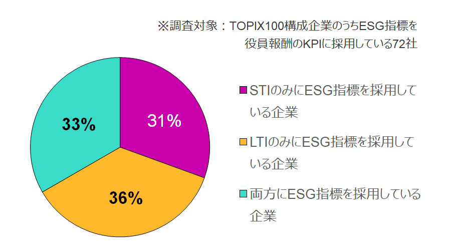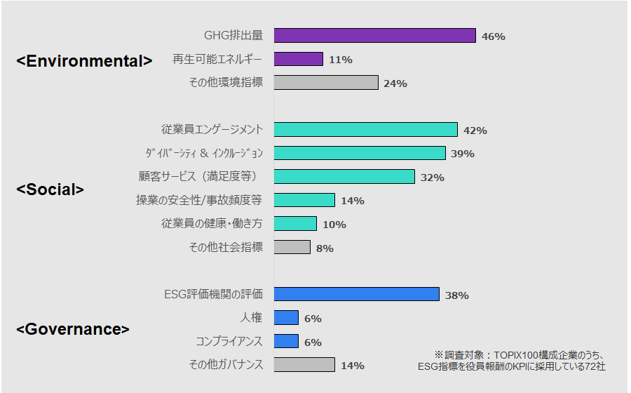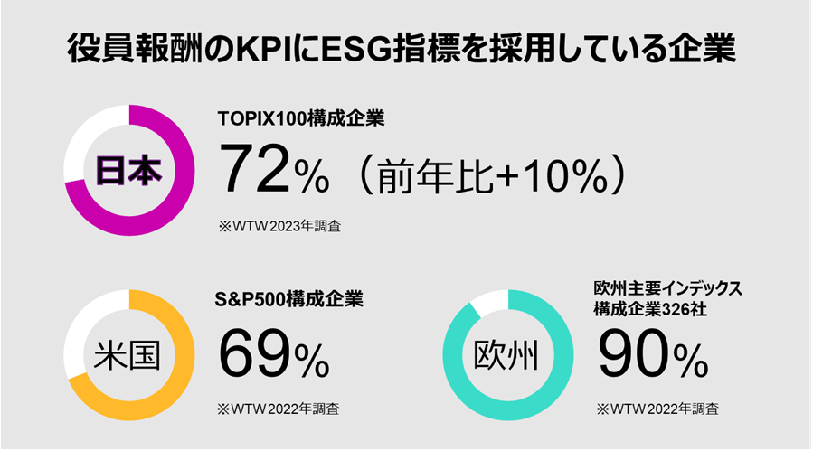 - 2023年の役員のインセンティブ報酬にESG指標を採用する企業は、TOPIX100構成企業の72%(昨年比+10point)となった。これは昨年時点における米S&P500構成企業を上回る普及率である。