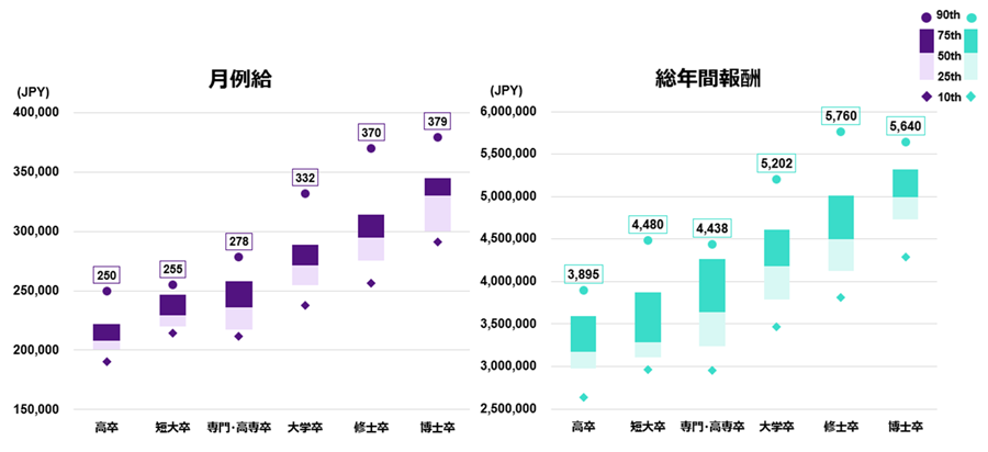近年の物価高、それに伴う政府からの要請等もあり国内の賃上げ動向が続く中、新卒者の初任給は企業の人材獲得戦略上、依然として注目度の高い指標である。特に日本企業においては初任給として月例給を比較することが多いが、競争力が相対的に低下し人材獲得・人材定着に影響を及ぼしていないかについて、総年間報酬ベースでも注視する必要がある。