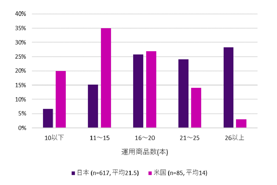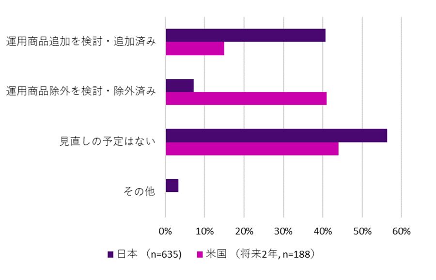 日本のDC制度においては「運用商品を追加する見直しは多いが、除外する見直しは少ない」という米国とは逆の傾向となっていて、属性の似た運用商品が複数存在するなど加入者に分かりにくいラインナップになっているケースもあります。