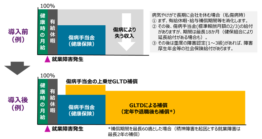 - 会社の見舞金・所得補償プログラム全体の再構築を図れます(GLTD導入を機に私傷病休職期間を見直す等)。