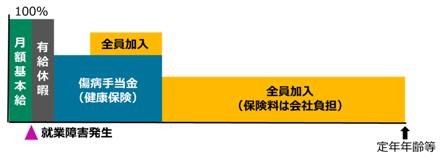 - 会社の給与補償や傷病手当金(健保)に加え、GLTD給付により従業員の生活の安定をサポートできます。