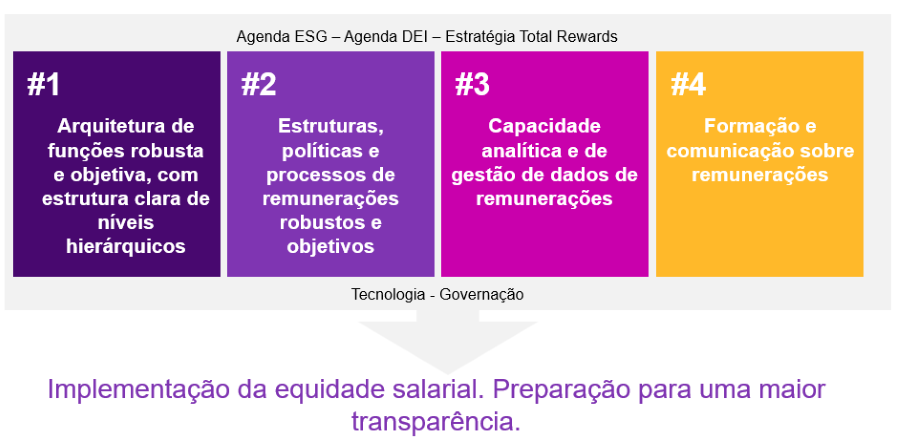 Isso é fundamental, pois a confiança na equidade e na transparência salarial vai além da análise de dados — envolve a existência de sistemas objetivos de funções e recompensas, bem como gestores e colaboradores capacitados e bem informados sobre as práticas de remunerações.