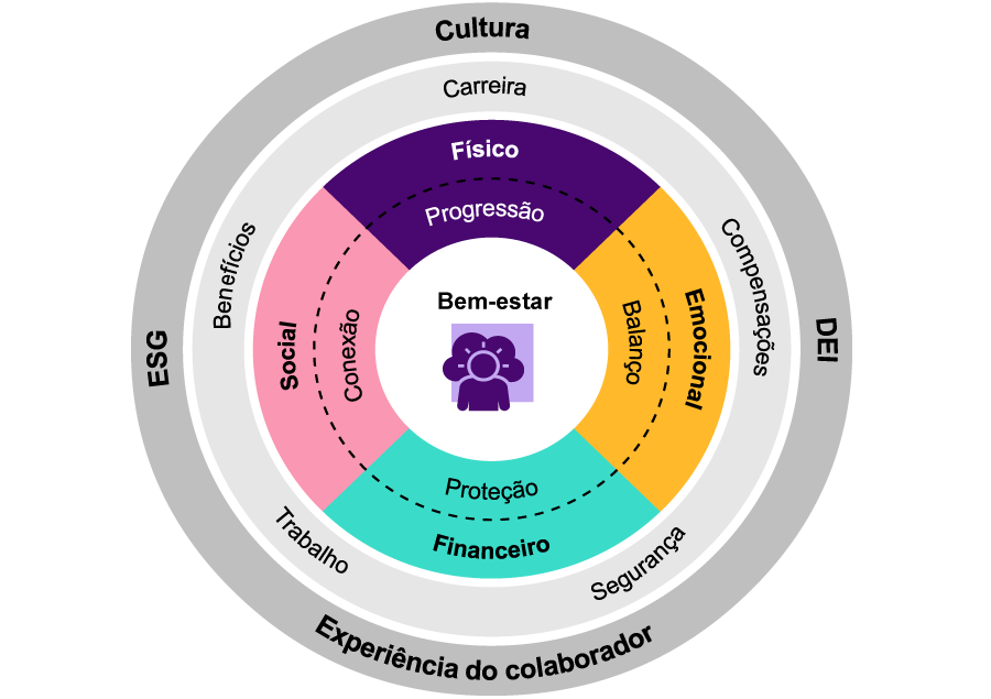 Uma abordagem bem-sucedida do bem-estar dos colaboradores integra vários pilares, como: