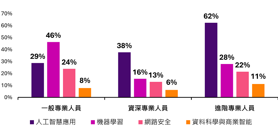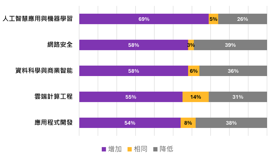 根據WTW的數位轉型實務報告,台灣企業過去一年中在招募與留任人工智慧應用與機器學習、網路安全、資料科學與商業智能等專業領域職位上面臨了巨大的挑戰。這些專業人才的需求在全球範圍內不斷擴大,尤其在資安領域,台灣的需求更是顯著。這與台灣長期面對來自不同地區的網路攻擊有關,促使企業加大對網路安全的投資。