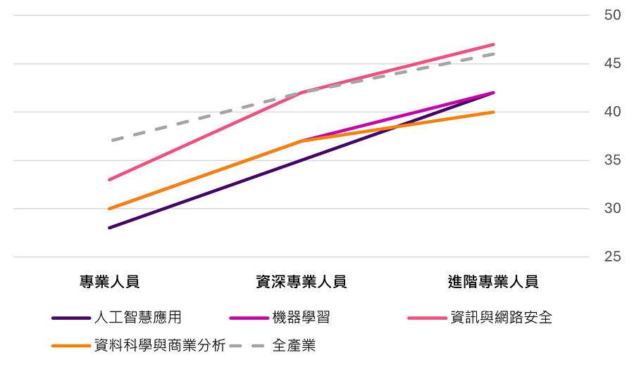 根據WTW 2023年數位人才整體獎酬市場調查報告,數位人才的年齡結構較整體產業年輕,一般專業人員的平均年齡多介於30歲左右,遠低於整體產業的平均年齡37歲。這一現象反映了過去十年數位技術的迅速發展,尤其是大數據和資料科學的興起。這些年輕專家在成長過程中深受數位環境影響,對數位知識的掌握度遠超上一世代的人。